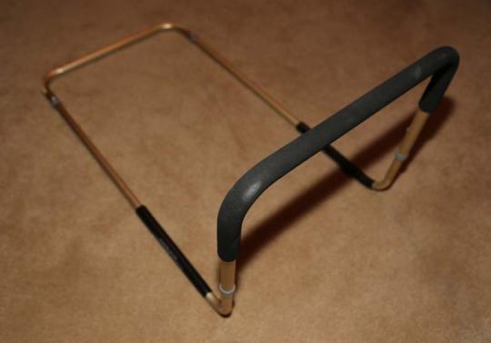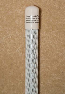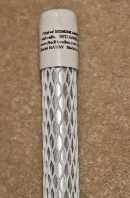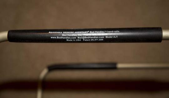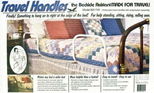 The L-shaped bed handles are made out of ? inch tubular steel, measure 20 inches wide, 16 to 20 inches tall and have 3 ft. poles that extend under the mattress. The Original Bedside Assistant® (BA10W) and the Travel Handles (BA11W) have a white handle with white poles that go under the mattress. The Adjustable Bedside Assistant® (AJ1) is gold in color and has a black cushioned foam handle. The bed handles are intended to assist adults with getting in and out of bed by giving them a bar to grip. Bed Handles Inc. and the model number are printed on a white label on the bed handles.
