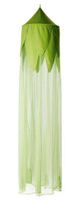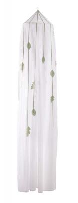 White pointed canopy top with green leaf decorations sewn on the sheer white fabric |