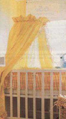 Yellow canopy attached to a stand which is clamped to the frame of a crib. |