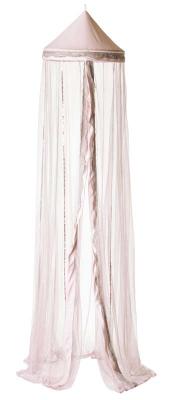 Light pink pointed canopy with pink lace and sequins sewn on the sheer light pink fabric |