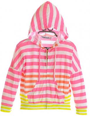 This recall involves girls zippered striped hoodies and tie dye jackets. The lightweight hoodie has multi-colored stripes (yellow, white, orange and pink). It has a drawstring hood, zip-up front and pockets on both sides. It is made from 100% Rayon and was sold in sizes S (7, 8), M (10) and L (12). A label sewn into the garment's neck seam reads "Flowers By Zoe" and a label sewn into the side seam reads style #SRH125MS.