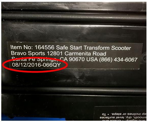 This recall involves Pulse Safe Start Transform electric scooters for children with manufacturing date codes between September 10, 2016 and October 11, 2016. The date code is printed on a label located under the platform in format XX(month)/XX(day)/2016 – 066QY. The scooters were sold in blue and have two wheels in front and one in the rear.