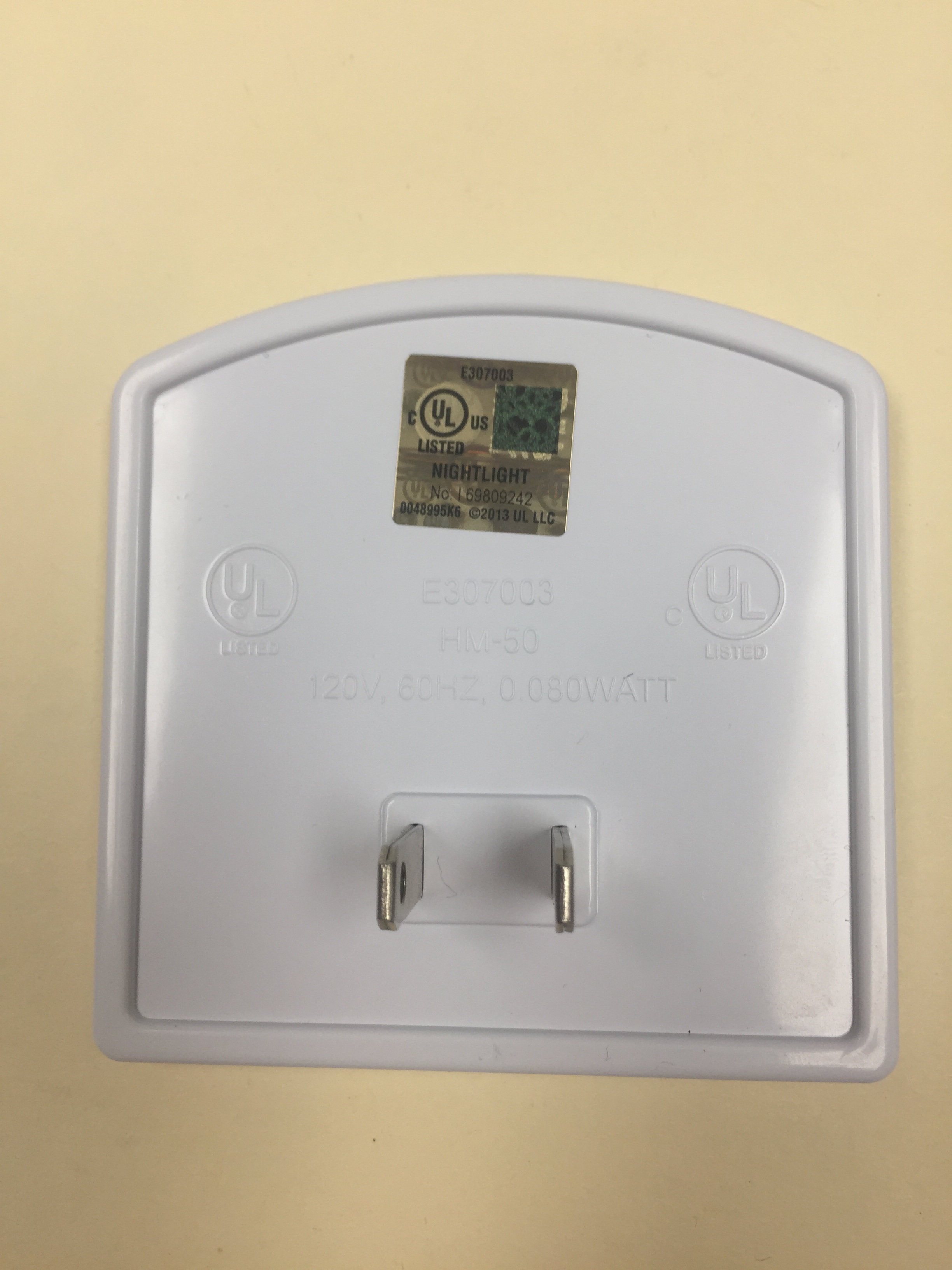 This recall involves luminescent night lights Model 2017-G, a square-shaped night light with a rounded top. The night light glows green when plugged into an electrical outlet. The back of the night light has a metallic sticker with the “UL” logo on it. If the UL label has a number on it beginning with the letter H or I followed by eight numbers, it is included in this recall. The night lights were given free to consumers, individually and in energy conservation kits.