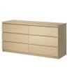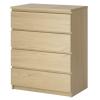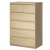 The MALM chests and dressers are constructed of particleboard or fiberboard and are white, birch (veneer), medium brown, black-brown, white stained oak (veneer), oak (veneer), pink, turquoise, grey, grey-turquoise, lilac, green, brown stained ash (veneer), and black. A 5-digit supplier number, 4-digit date stamp, IKEA logo, country of origin and “MALM” are printed on the underside of the top panel or inside the side panel.