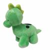 a green plush dinosaur with grey feet and black spots on his back and a silver colored metal wind up post and handle on the dino’s left side |