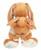a tan plush mama and baby bunny with embroidered lettering on the mama’s right foot and a silver colored metal wind up post and handle on the mama’s backside |