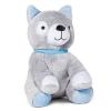 a gray and white plush puppy with light blue inner ears and back feet and a silver colored metal windup post and handle |