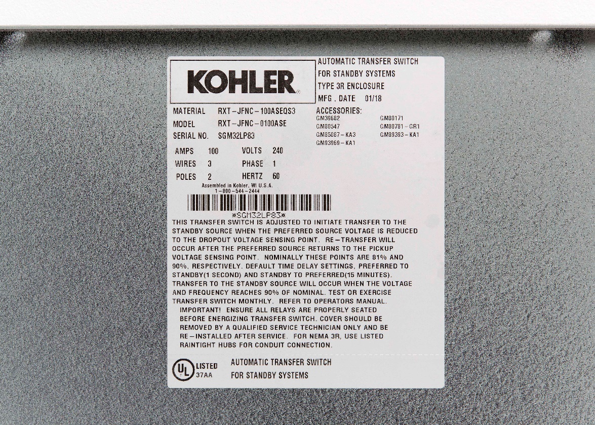 This recall involves Kohler 100-amp service entrance rated automatic transfer switches used with Kohler brand residential and commercial generators. “Kohler” is printed on the outside panel. Model number RXT-JFNC 100ASE and the serial number are printed on a nameplate located on the inside cover of the unit.