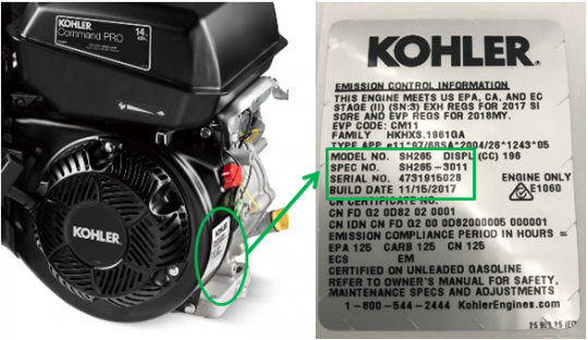 This recall involves Kohler gasoline engine models SH265, CH245, CH255, CH270, CH395, CH440, and ECH440. The engines are used in a variety of outdoor power equipment including log splitters, generators, wood chippers, stump grinders, pressure washers, water pumps and snowbrushes and were also sold separately. Model numbers, spec numbers, serial numbers, and build dates are printed on a silver label attached to the lower-right side of the engine.
