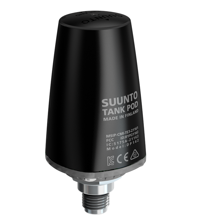 This recall involves Suunto Wireless Tank Pressure Transmitters and Tank PODs: The Suunto Tank POD has a black cone-shaped plastic case with SUUNTO TANK POD, MADE IN FINLAND printed in gray color on the case and a transparent plastic base. See photos above.