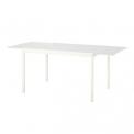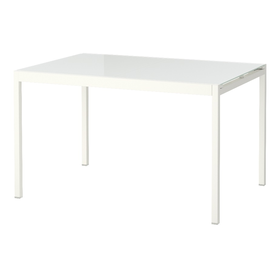 This recall involves IKEA GLIVARP extendable dining tables in white. The recalled tables have four steel legs and a glass table top with an extension that can be pulled out to the side. They measure about 29 inches tall by 49 inches long. The glass table top extension measures about 25 inches long. The supplier number (12003) is printed on a sticker on the underside of the table frame. “GLIVARP” and the IKEA logo are also printed on the sticker.
