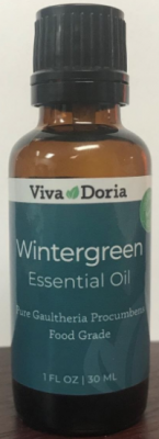 This recall involves Viva Doria Wintergreen Essential Oil in a 30mL (1 fl. oz.) amber glass bottle with a black euro dropper cap. The UPC code 638037993110 is listed on the product label, under the bar code. The green label on the front of each bottle displays the Viva Doria logo, product name, and the volume amount of the bottle.
