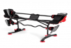 This recall involves the Bowflex SelectTech 2080 Barbell with Curl Bar. The product consists of two metal bars, one straight and one curled, which are used one at a time. The bar is inserted into a base, and the user selects the number of weight plates needed to reach the desired weight by turning an adjustment knob. The barbells are black with a red Bowflex logo on the weight selector dial. The storage tray is marked with the name “Bowflex” and the Bowflex logo in the center.