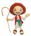 This recall involves the Shepherd Boy plush toy that holds a shepherd’s staff. The toy measures 12 inches tall. The staff is wrapped in fabric. The shepherd boy toy is clothed in white with a red vest, a green sash and has sandals, a sewn on face and orange yarn hair.