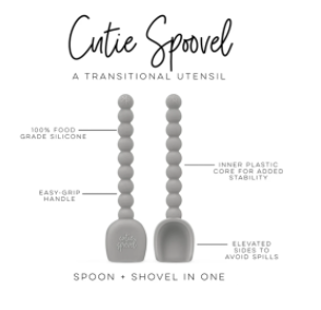 The Cutie Spoovel is a transitional eating utensil for young children. It is made out of silicone with a plastic core and comes in a set of two in various colors. “Cutie Spoovel” is printed on the back of the spoon, and RR is printed on the back of the handle on the end.