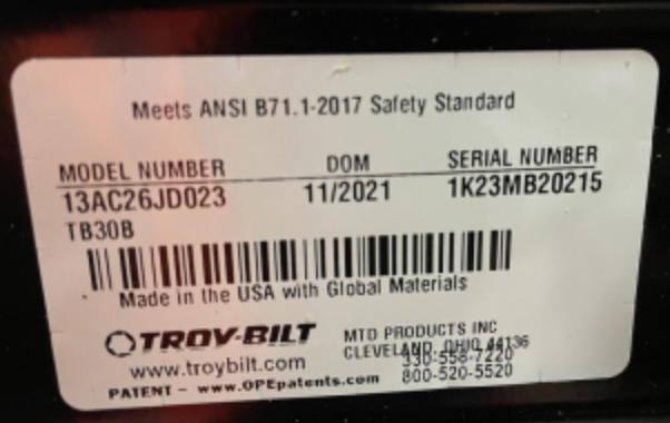 This recall involves Craftsman 30” mini and Troy-Bilt TB30 riding lawn mowers. The lawn mowers are red and black. Troy-Bilt or Craftsman are printed on the front column. Recalled lawn mowers are not marked with a green X, were manufactured from July 20, 2021 through December 17, 2022, and have serial numbers 1G20MB20001 through 1L17MB20228. The month and year of manufacture are found on the model plate label under the heading DOM for Date of Manufacture. The third and fourth characters of the serial number identify the manufacturing day. For example, serial number 1G20MB20001 would mean the mower was manufactured on the 20th day of the month of July. Months are listed A (January) through L (December). The date of manufacture, the serial number, which includes the full manufacture date, and the following model or SKU numbers can be found on the model plate label on the bottom of the seat pan: