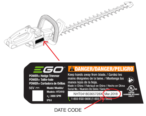 This recall involves EGO Power+ Model HT2410 Cordless Brushless Hedge Trimmers that were manufactured prior to March 30, 2019. The hedge trimmers have a gray, black and green housing, yellow, 24-inch dual-action steel blade, a black loop handle with a green switch trigger in front of the product housing, and rear switch trigger underneath the rear handle. The EGO logo is displayed on one side of the product housing, and the model number HT2410 and manufacturing date code are displayed on the opposite side. Only units with date codes from September 2017 through March 2019 are included in this recall.