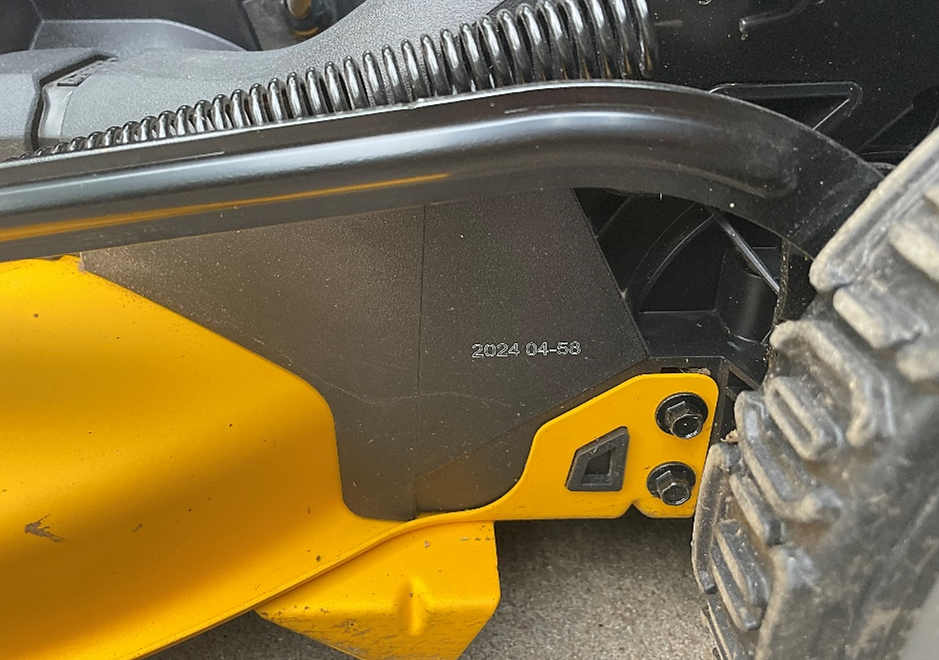 This recall involves 2024 model year DeWALT Battery 21” Push walk-behind mowers, model numbers DCMWP234U2 and DCMWP600X2, and DeWALT Battery 21” Self-Propelled walk-behind mowers, model numbers DCMWSP256U2 and DCMWSP650Y2. The mowers are black, gray and yellow and have DeWALT printed in yellow on the front or side of the mower. The model number is printed on the rear door of the mower. A date code formatted as 20XX YY-58, with 20XX for year, YY for week, and 58 as the factory code, is laser-printed in yellow on the left side of the mower, just above the left rear wheel. Only date codes 2023 32-58 through 2024 13-58 are affected. Mowers manufactured after March 2024 (2024 14-58) are not affected.