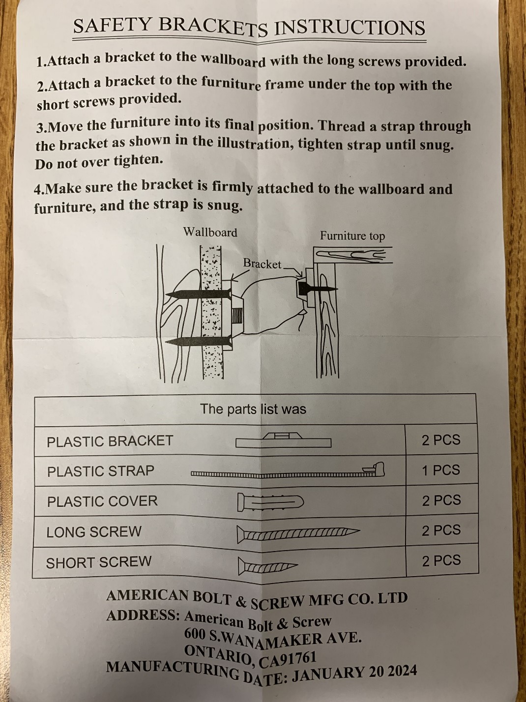 This recall involves tip-over restraint kits that were sold with chests and dressers. The kits were packaged in a red plastic bag containing a plastic zip tie, two white plastic brackets, four screws, two white plastic drywall anchors and an instruction sheet. “American Bolt & Screw MFG CO. LTD, ADDRESS: American Bolt & Screw, 600 S WANAMAKER AVE., ONTARIO, CA 91761,” and “MANUFACTURING DATE: JUNE 20, 2023” or “MANUFACTURING DATE: January 20, 2024” are printed on the bag and on the instruction sheet. The kits were distributed with certain clothing storage units manufactured by Canyon Furniture including chests and dressers in the Canyon Lake, Canyon River, Cottage Colors, Creekside 2.0, Ivy League 2.0, and Modern Colors furniture lines. Affected clothing storage units have a white label on the back of the unit that says “Canyon Furniture Co.” in black text, as well as a model number beginning with “CANY” and the manufacture date.