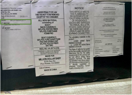 This recall involves Babyletto Kiwi Electronic Recliner and Glider fabric-covered chairs with two USB device charging ports. The chair is covered in various color fabrics and is approximately 29 inches wide by 36 inches deep and 41 inches high and weighs approximately 125 pounds. Units included in the recall include the following production colors, SKUs, and batch numbers. Batch numbers are printed on a white label found underneath the footrest.
