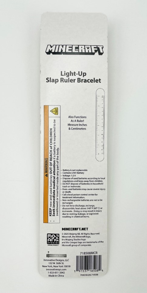 Consumers should immediately stop using the recalled Minecraft Light-Up Ruler Bracelets and take them away from children. Contact Innovative Designs for information on disposal and for a full refund. Consumers will need to email a photograph of disposal to info@innovativenyc.com to receive the refund.