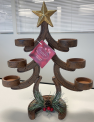 This recall involves St. Nicholas Square Christmas Tea Light Candle Holders. The candle holders are shaped like a Christmas tree made from plastic horseshoes and hold six tea light candles. There is a gold star at the top of the candle holder and green plastic garland with plastic red berries at the base of the candle holder.