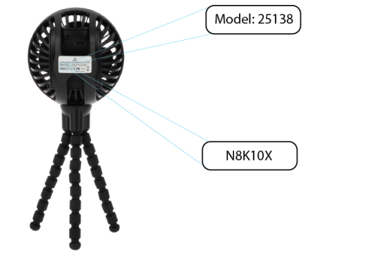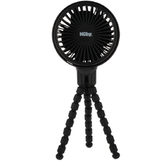 This recall involves Nuby Stroller Fans with three speeds, adjustable tripod legs and a rechargeable USB port used for babies and toddlers. The flexible tripod legs wrap around the bar of the stroller. The plastic fans are black with the Nuby brand name printed on the center on the front of the fan. The lot number N8K10X and model number 25138 are printed on a white label on the back center of the fan.