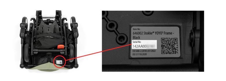 This recall involves YOYO3 strollers with serial numbers starting with “142AA” followed by numbers that fall below “0062239.” Only strollers with these numbers are affected. The compact four-wheel foldable strollers are designed for children aged approximately 0 to 48 months. The stroller frame is black or black and white, and the stroller seat and canopy are black, Bonpoint beige, stone, olive, taupe, toffee, ginger, Air France blue or aqua. The wheels have a white reflective center. The serial number is located on a tracking label under the stroller seat.