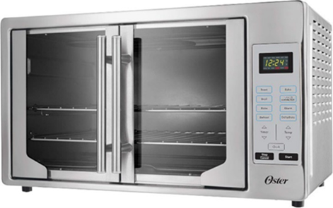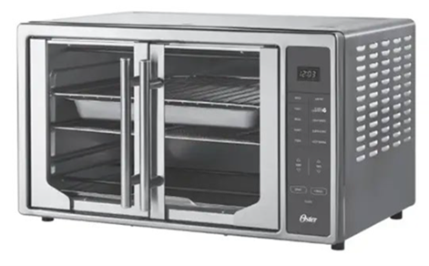 This recall involves Oster French Door Countertop Ovens with model numbers TSSTTVFDXL, TSSTTVFDDG, TSSTTVFDMAF and TSSTTVFDDAF. The recalled ovens have a spring-loaded bilateral door made of glass with metal handles. A label on the backside of the oven identifies the model number. In addition, the original packaging has information identifying the model number. The four models differ in cooking options (e.g., air fryer) and control types (analog dials or digital push-button controls). “Oster” is engraved on the front bottom right of the oven.