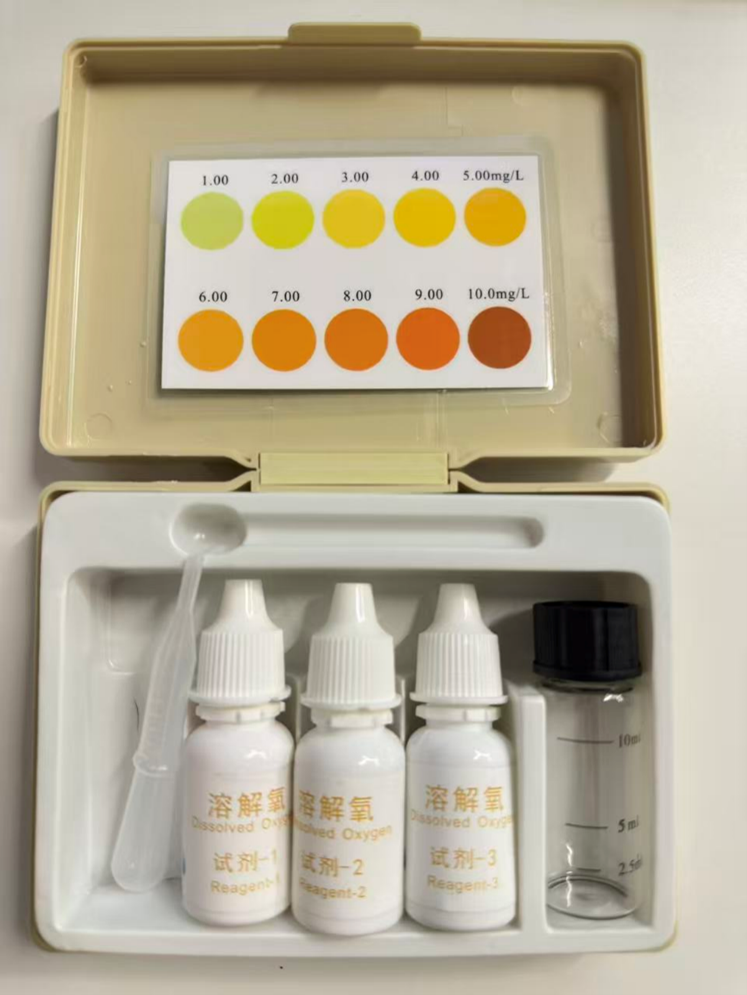 This recall involves Almpal dissolved oxygen test kits. The test kits come in a cream-colored box bearing a white label with “Dissolved Oxygen Test Kit” and the manufacture date, batch number, and expiration date printed on it.