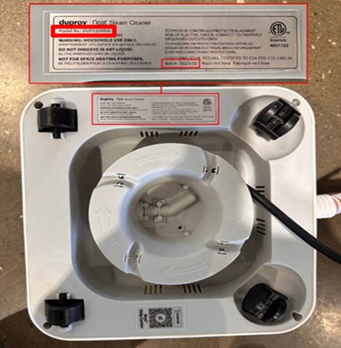 This recall involves the portable Dupray Neat Steam Cleaner. It is designed to clean, detail, sanitize, and deodorize household surfaces. The cleaner comes with a white base connected to a black flexible hose. The Model Number is DUP020WNA. Batch/Date Code 0118-01 through 0425-05 are on the rating label located on the bottom of the cleaner. The cleaner includes an accessory set that comes with various brushes, tools, a Velcro pad and dust cloths.