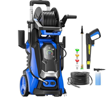 This recall involves Le Hao Tool electric pressure washers sold in green or blue with black trim, measuring about 25 inches high, 12 inches wide and 11 inches deep. The pressure washers come with a touch screen, foam cannon, four quick disconnect nozzles, a 20-foot hose and two rollers. Labeling on the front of the pressure washer reads “ELECTRONIC High Pressure Washer”.