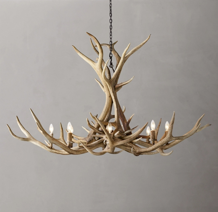 This recall involves RH 48” and 60” diameter Natural Antler Chandeliers manufactured between September 2021 and October 2024 per customer special order and hung at an angle on a vaulted ceiling or sloped beam. The chandeliers are made from naturally shed elk antlers and were sold in three finishes: natural, sun-bleached and black. The 48” diameter chandelier measures about 48” tall and weighs about 40 pounds and was sold with SKU numbers 10036671NAT, 10036671SUNB and 10036671BLK. The 60” diameter chandelier measures about 36” tall and weighs about 45 pounds and was sold with SKU numbers 10035099NAT, 10035099SUNB and 10035099BLK. The SKU number is located on the order confirmation and printed on the receipt.