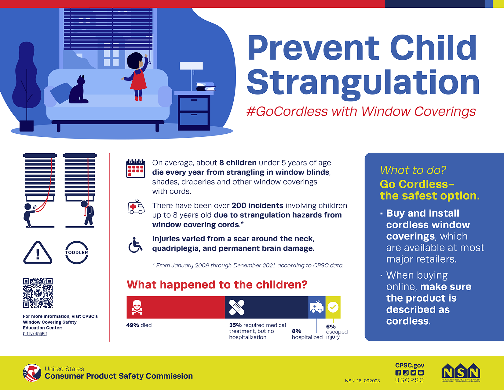 CPSC encourages consumers to buy and install cordless window coverings, which are available at most retailers. When buying online, look for products described as cordless.