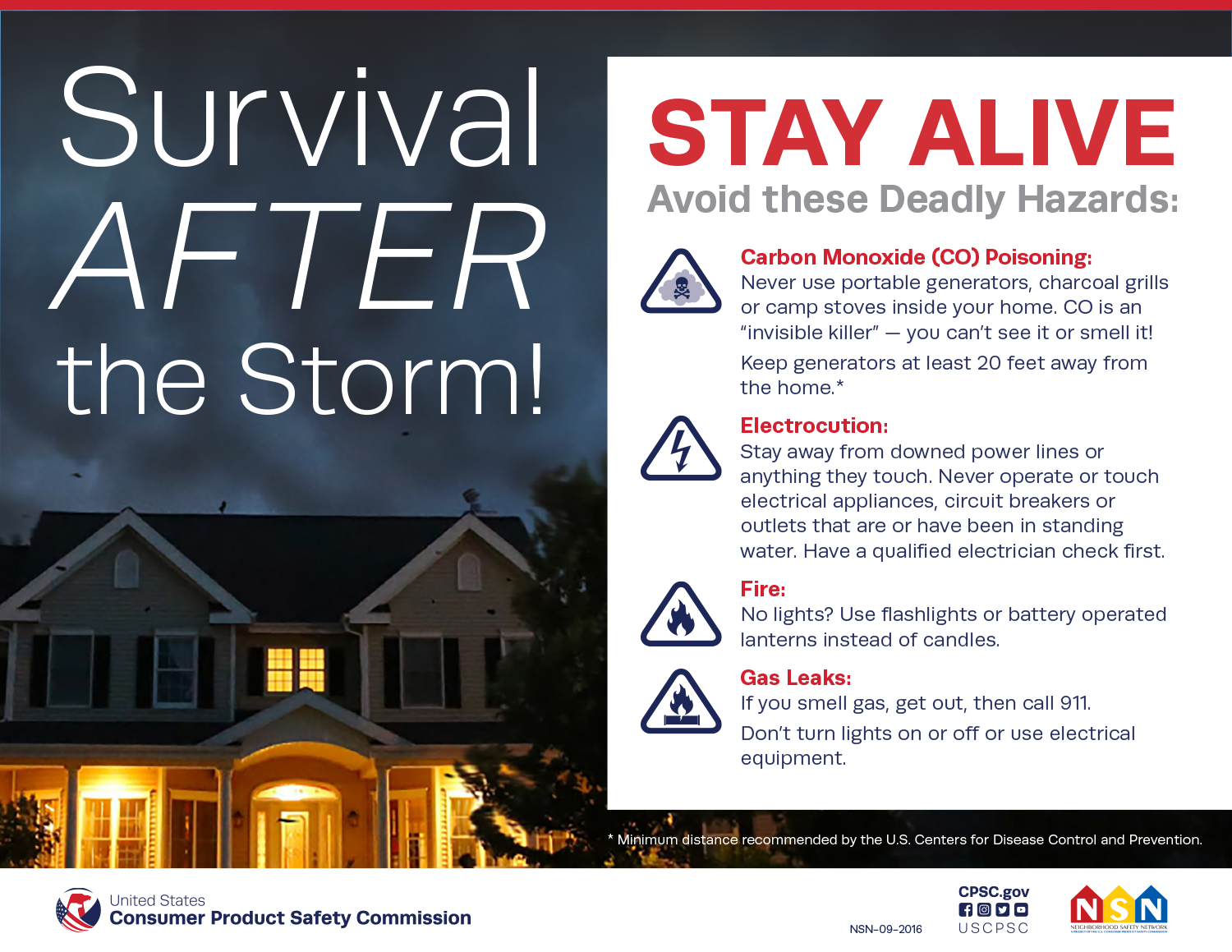 Deadly dangers exist after a hurricane strikes. Safety tips on portable generators, candles, gasoline, charcoal and appliances.