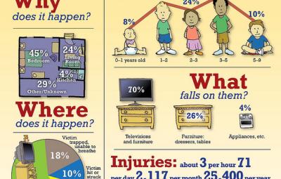 One child dies every two weeks when a TV, piece of furniture or an appliance falls on him or her. Anchor furniture to the wall or floor and place TVs on sturdy, low bases.