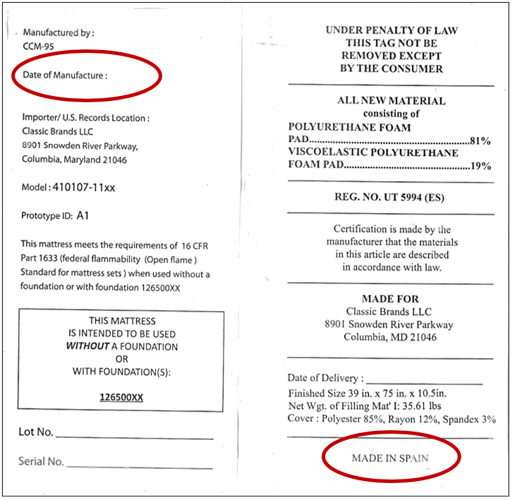 This announcement involves about 21,655 “Classic Brands” 10-inch “Cool Gel Memory Foam” mattresses which were manufactured in Spain between January 2021 and August 2022, and sold on Amazon.com, Walmart.com, and Wayfair.com, as well as online at HomeDepot.com, Macys.com, and Target.com, from March 2021 through October 2022. “Cool Gel Memory Foam” is printed on the side of the mattress. The mattresses were sold in the following sizes: Twin, Twin XL, Full, King and California King.