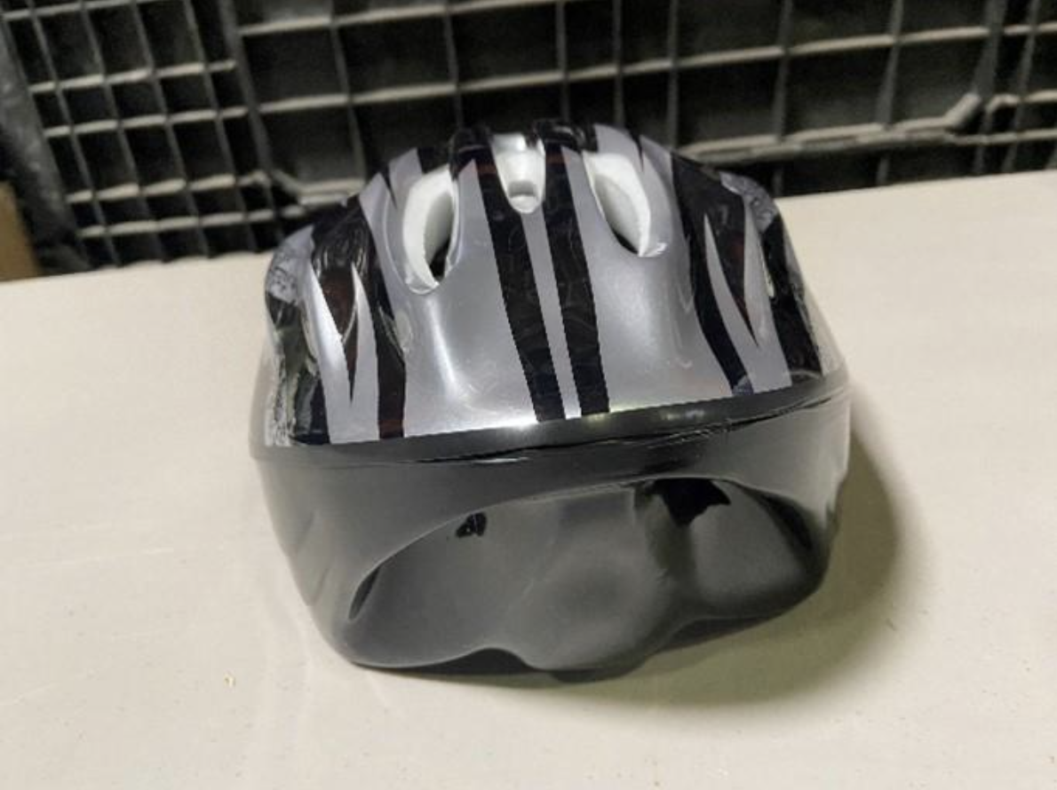 The adult bicycle helmets were sold online at www.walmart.com from August 2022 through February 2023 for about $11. The helmets were sold in one adjustable adult size. The helmets have 11 vents and are silver with a black striped pattern, black straps and a black buckle.