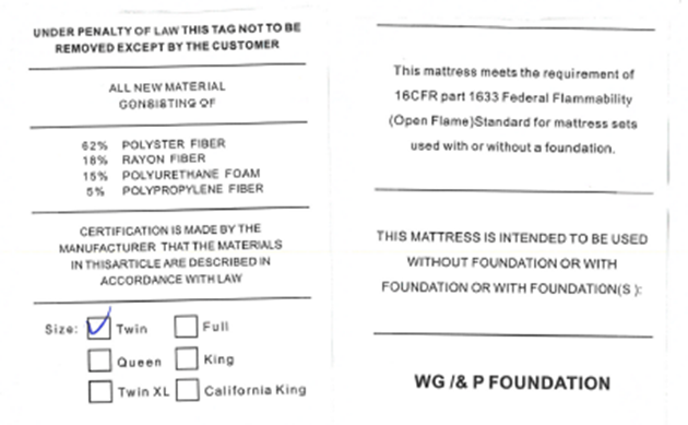 The mattresses were sold in sizes twin, full, queen and king and have a gray knit top panel and black and gray side panels. The size, material, and “This mattress is intended to be used without foundation or with foundation or foundation(s): WG /& P Foundation” are printed on stacked labels at the side seam of the mattresses.