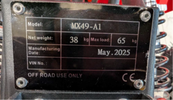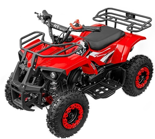 The youth ATVs have a 49cc gasoline engine, model MX49-A1. The youth ATVs were sold in red and blue. “AUNVITO” is the online brand. The youth ATVs have “MX MOTO” printed in white on the ATV side body and handlebar covers. “MX49” is printed in black on the front fenders. The youth ATVs have a metal VIN plate mounted to the front frame labeled with “Model: MX49-A1”.
