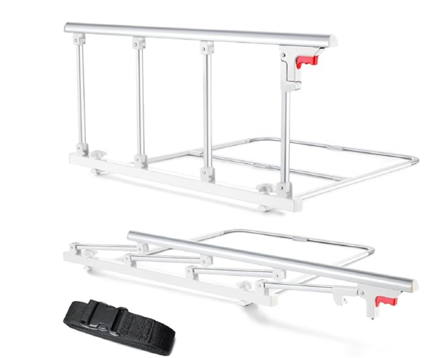 The bed rails were sold for use on adult beds. They are silver and measure about 38 inches long, 17.5 inches high, 31.5 inches deep, and weigh about 7 pounds. The foldable bed rails have four metallic support bars and a metallic top rail with a red release button that collapses the bed rail and comes with a black nylon strap to secure the bed rail when folded. SKU “SV-2M0R-KE9E” is printed on the product packaging.