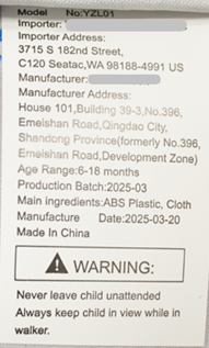 CPSC issued a Notice of Violation to Qingdaojinmuyudianzishangwuyouxiangongsi, of China, doing business as Happy-Kingdom. The firm has been unresponsive to CPSC’s request to recall these infant walkers or offer a remedy to consumers.