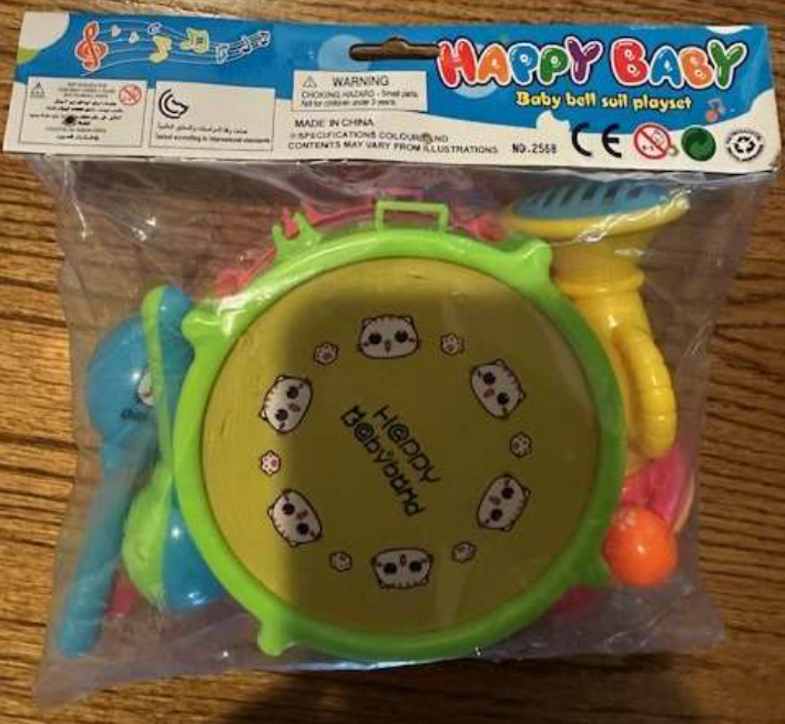 WASHINGTON, D.C. – The U.S. Consumer Product Safety Commission (CPSC) is warning consumers to immediately stop using Malinaggg Happy Baby Musical Instrument toy sets. The infant musical toys have maracas and drumsticks with spherical ends, posing a choking hazard and a strap on the drum that can entangle around a child’s neck, posing a strangulation hazard. These hazards pose a serious risk of injury or death to children.