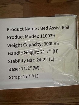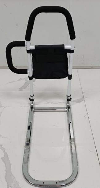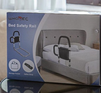 The bed rails, model number 110039, were sold for use on adult beds. The bed rails have white and silver metal tubbing with black foam handle grips and a fabric pouch. They measure about 25.6 inches tall by 14.9 inches wide and 24 inches long. The brand “Whomec” and model number are printed on the product packaging.