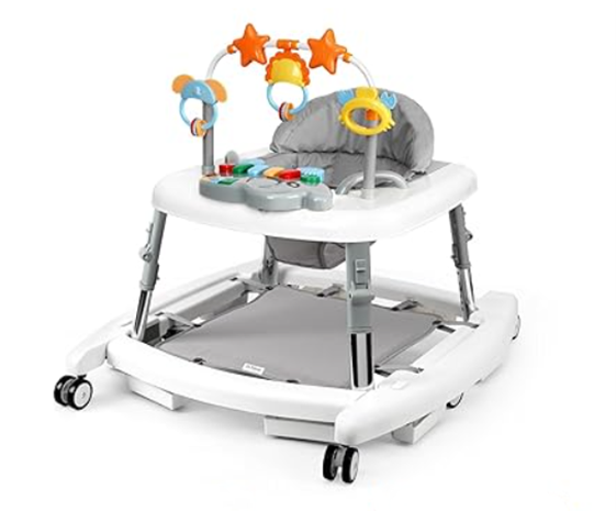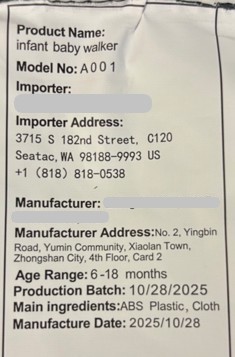 The Wolfcode infant walkers are foldable, have five adjustable height settings, and were sold in gray/white, black/white, pink/white and white color combinations. They have six-wheel assemblies with a detachable music box and colorful rotatable toys. “Model No: A001” and “Infant baby walker” are printed on a label on the seat’s underside.