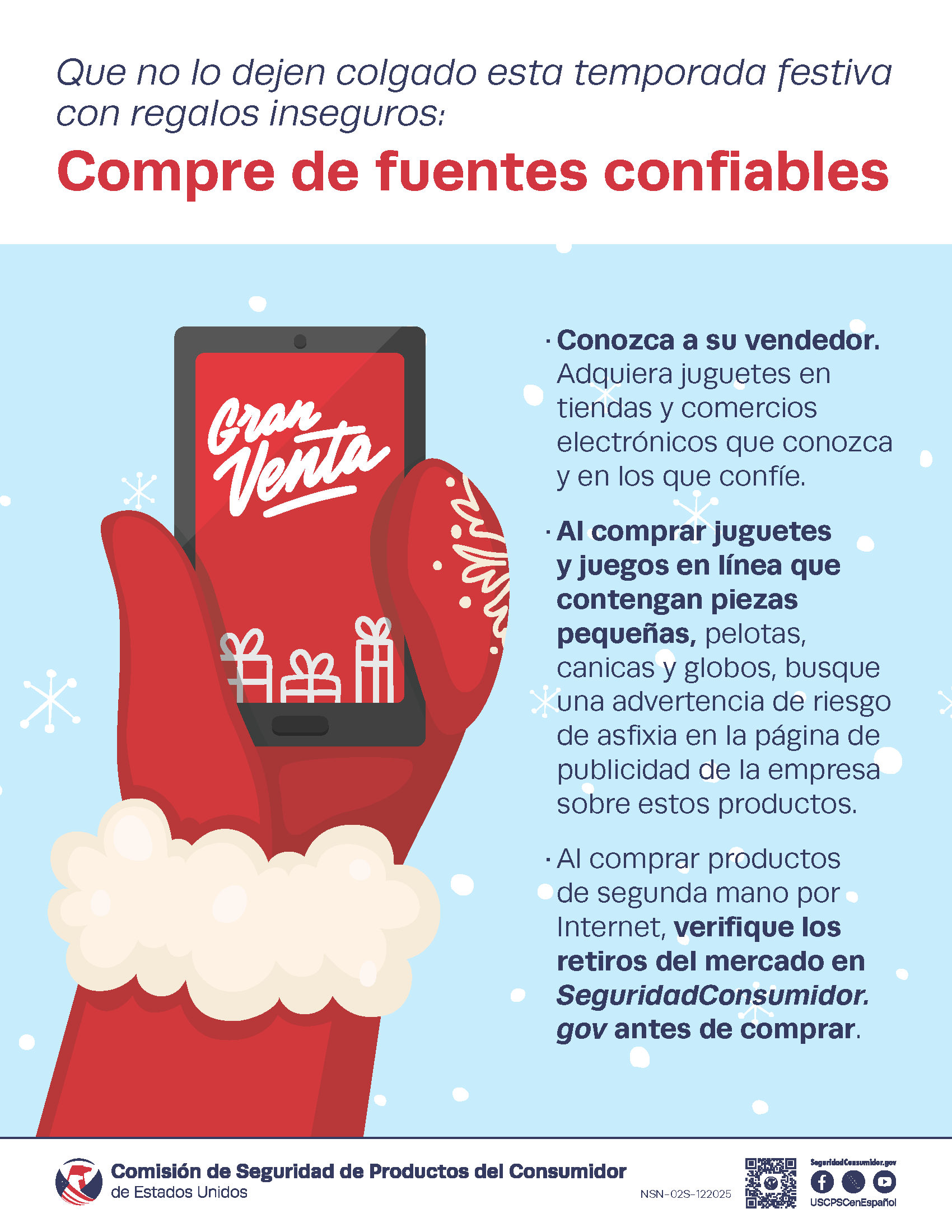 - Al comprar productos de segunda mano por Internet, verifique los retiros del mercado en SeguridadConsumidor.gov antes de comprar.