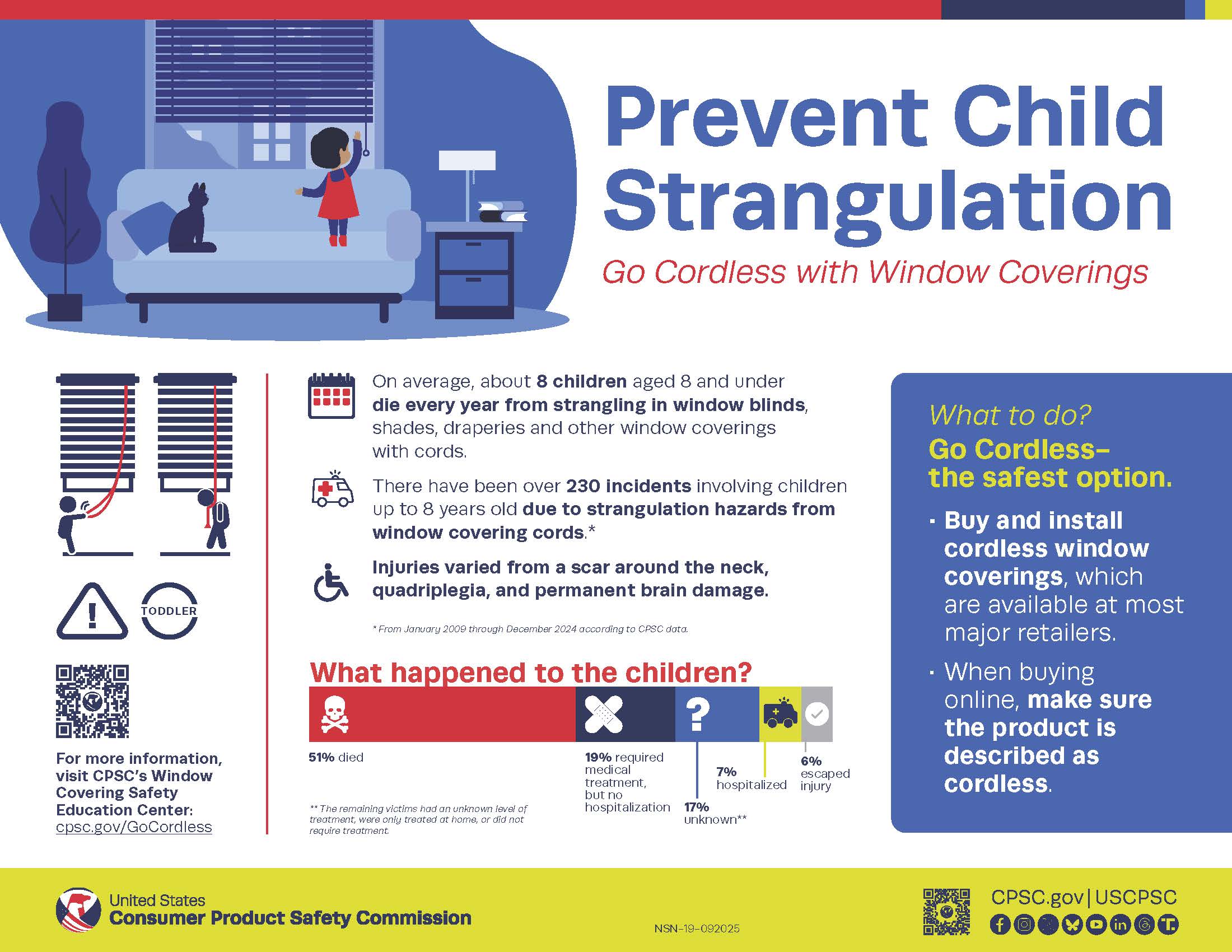 CPSC encourages consumers to buy and install cordless window coverings, which are available at most retailers. When buying online, look for products described as cordless.