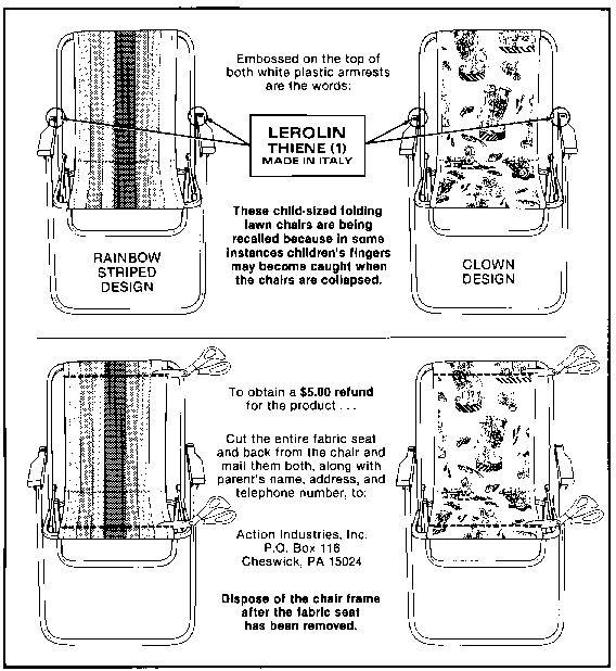 Consumers are urged to remove the chair from use immediately. To obtain a $5.00 refund for the product, consumers should cut the entire fabric seat and back from the chair and mail them both, along with their name, address and telephone number, to Action Industries, P.O. Box 116, Cheswick, Pa 15024. Refunds will be made only for chairs which match the description above. Owners are also advised to dispose of the chair frame after the fabric seat has been removed.