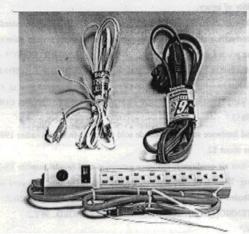 The extension cords and power strip surge protectors present fire and shock hazards.