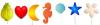 Green bug White, pink or red flower Red heart Yellow moon Blue seashell Blue star Orange seahorse